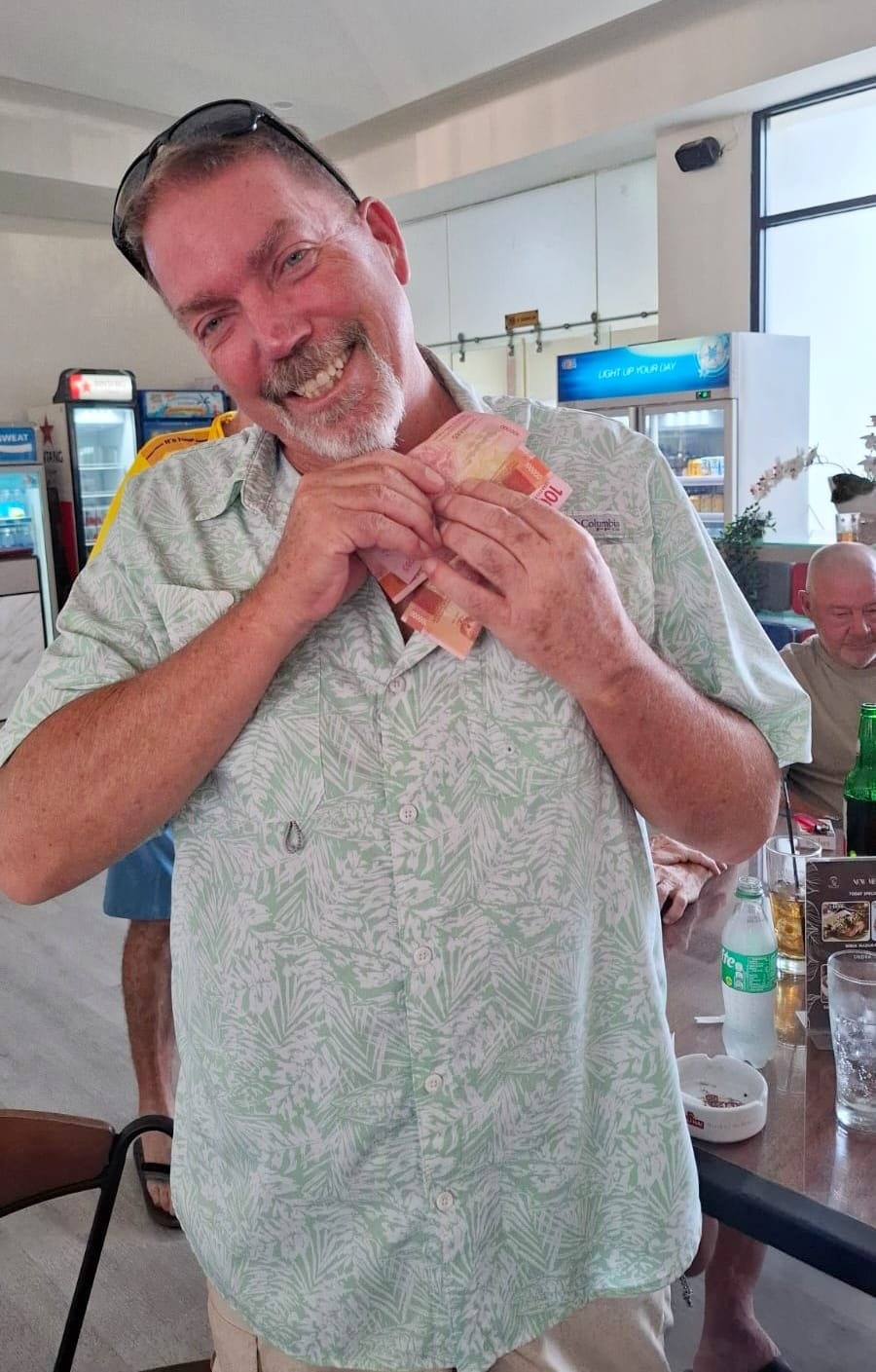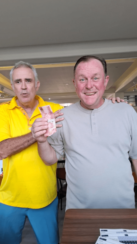 Gee I have never seen such happy golfers picking up a few quid. They are happy as they had had a good arm wrestle with PJ and did better than their TeeSet counterparts who were drinking the blues away. See behind fish below.