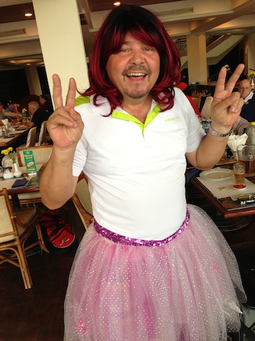 A fine addition to the Tee Set wardrobe thanks to Santi Miller’s donation of a rather fetching wig. A few tried it on after the game including Evaldo Roos who earned