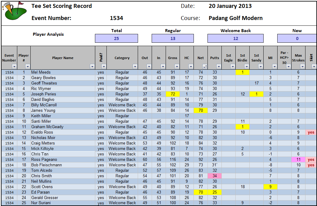 Sending your intention to play has proven super successful and makes life easy for our administration to get us away on time. Please continue to advise your intention to play. 26 registered and 25 played this week. Two cancellations due to sickness and one got lost (Oh Craig, how did you manage that?) which means 2 came without registering. Good enough.