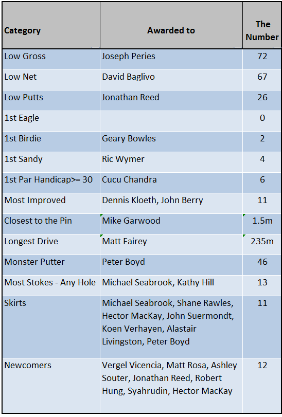 Joseph Peries shot a great even par for the day to take low gross while playing partner Dave Baglivo shot 5 under his handicap to take low nett. Just shows what a few squirts of JD before tee off can do for the swing. Harry Hill took nearest to the pin and Matt Fairey a fine longest drive.