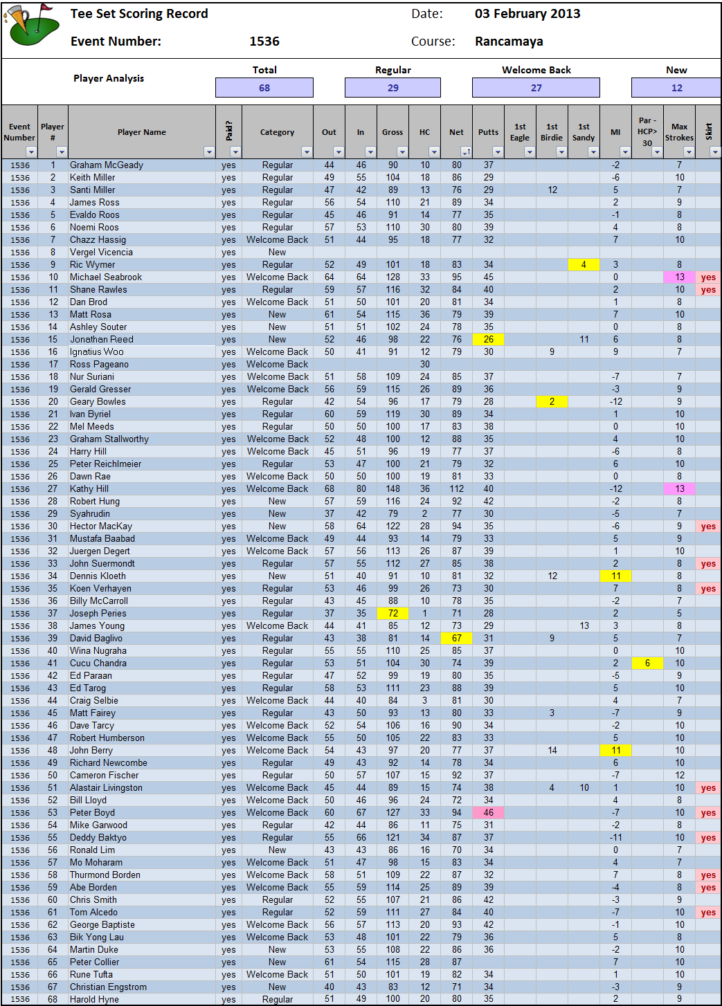 12 new players showed up which was way too many for our results spread sheet to display correctly. Matt Rosa, Ashley Souter, Jonathan Reid, Robert Hung, Syahrudin, Hector MacKay, Dennis Kloeth, Ronald Lim, Martin Duke, Peter Collier and Christian Engstron……we welcome you all to Tee Set.