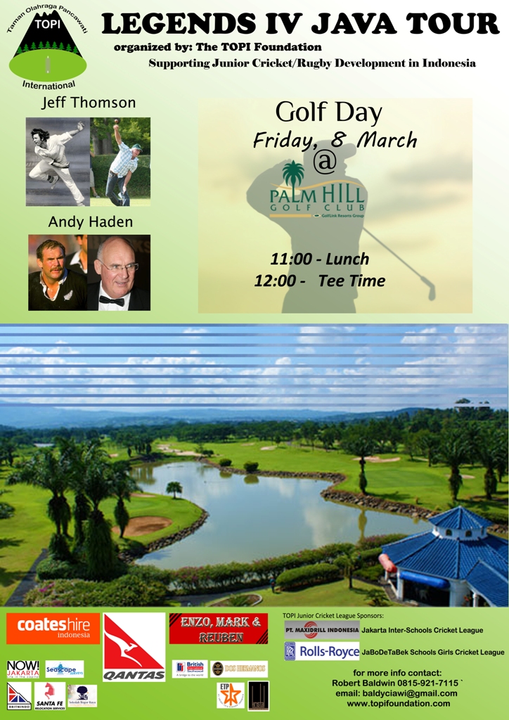 That great supporter of youngsters cricket and rugby in Jakarta, the TOPI Foundation, is holding their 4th Legends IV golf day at Palm Hill on Friday 8th March. The whole event regularly garners personal support from a number of sporting legends and this year you can expect to get up very close to that great Aussie fastie, Jeff Thompson, and Andy Haden who played lock forward for the All Blacks on 42 occasions. You will find details of the day here.