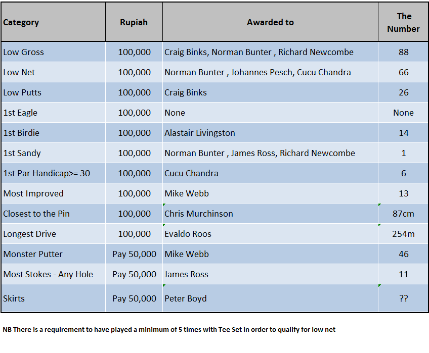 BANDUNG BASH at Giri Gahana 29 to 31 March – reservations here are also now closed and the course and hotel advised of numbers. If you would like to be put on the stand-by list please contact Ibu Endang and she will try and get you in.