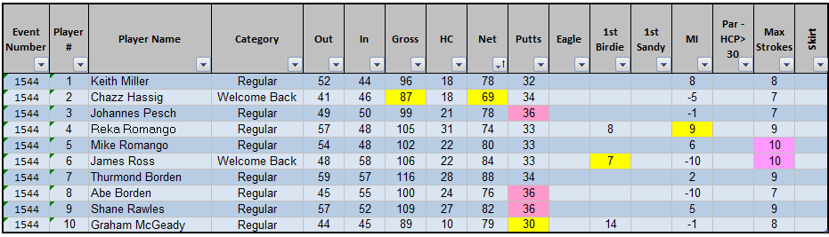 PJ is never a walkover, however, and Low Gross was to be a somewhat elevated 87 from Chazz Hassig who shot an uneven 41-46-87, while Reka Romango was Most Improved with an even more uneven 57-48-105: well done Reka.