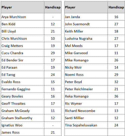 Sunday: low net, low gross, low puts, nearest the pin, first sandy, first birdie, first par hc>30 and fancy dress.