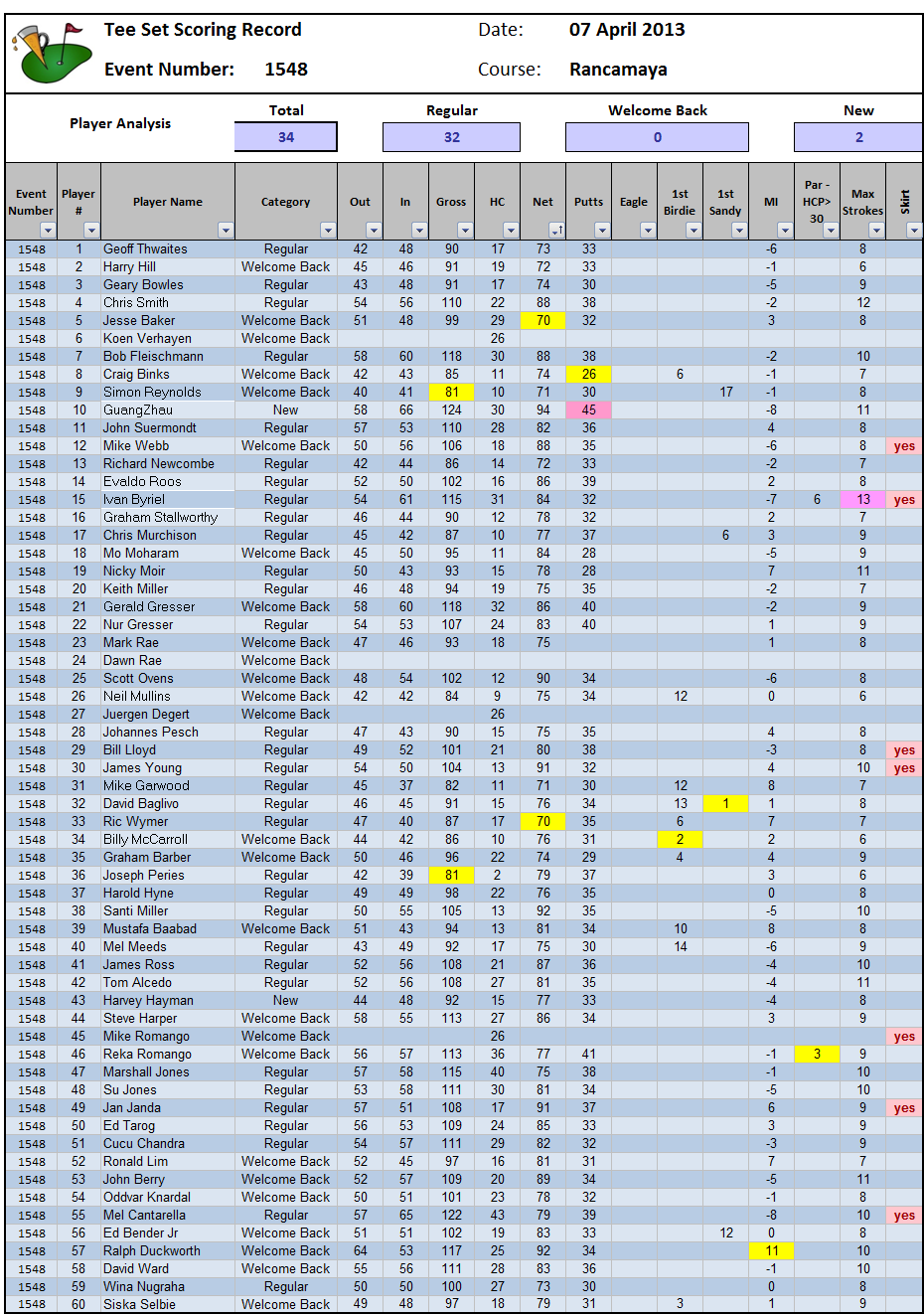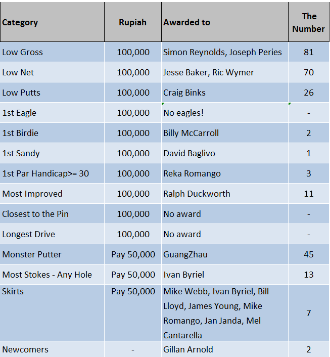 Pleasing to see the huge number of 26 Welcome Backs and also one Newcomer who was to win his Tee Set spurs ; welcome Guangzhao, enjoy your golf with us, you won’t always get the Monkey! An especially warm welcome back to a Siska Selbie who no longer counts Jakarta as home!