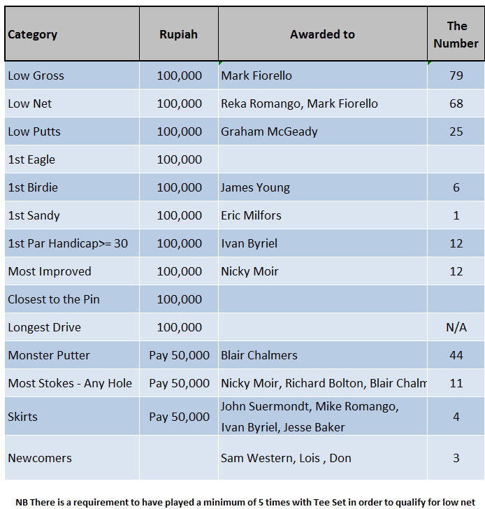If Nicky Moir’s 51/39/90 was a ploy to claim the Rp.100,000 for the most improved award then it certainly worked, while Reka Romango took low net yet again with a 68 and is now firmly in the sights of the handicapper. Great effort from Mark Fiorello who shot the best round of the day with a gross 79. Probably would have done the same last week at Bogor Raya had he been able to penetrate the Puncak road gridlock and actually reach the course.