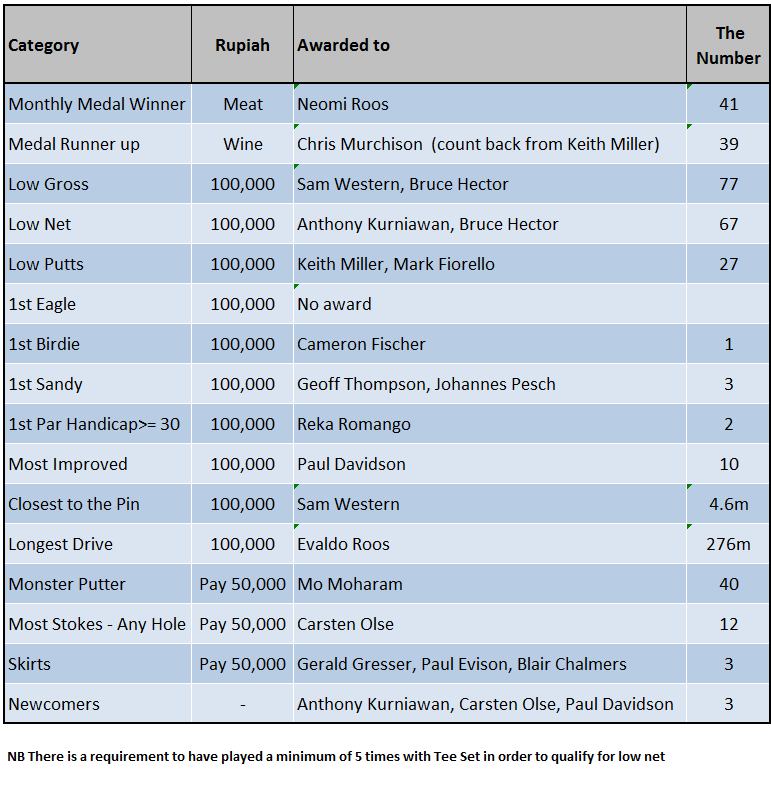 One for your diary is the Tee Set 30th anniversary event to be held at the very special Royale Jakarta on Sunday 7th July. This is a major milestone in Tee Set’s history with, yes, 30 years completed without missing one weekend round of golf. Please join in and let all your friends know that they are welcome to join the golf and festivities including a fabulous post round lineup of entertainment, with a band and other attractions which are guaranteed to keep us entertained and laughing into the evening.