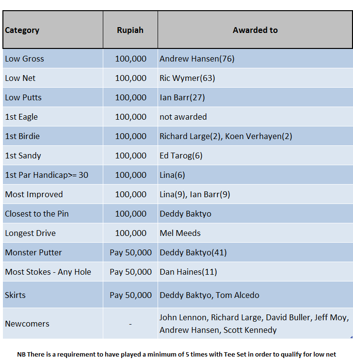 Tee off is 12:10 at the lovely Karawang International course km post 46 on the Cikampek Toll. Price is Rp660K all up. Hope to see you all there.