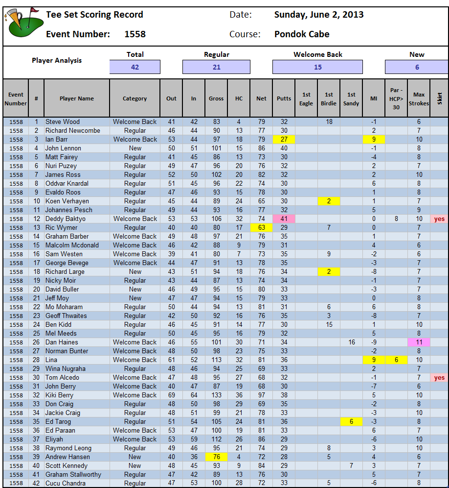 It’s been great having you Graham and we wish you every success in your future endeavors. Davis, Jeff, Andrew and Scott all up from Oz just for the week to join Graham’s farewell were our new players as were John Lennon and Richard Large. So with 25 regulars, 11 welcome backers and 6 new players it was a great turn out with 42 Tee Setter old and new.
