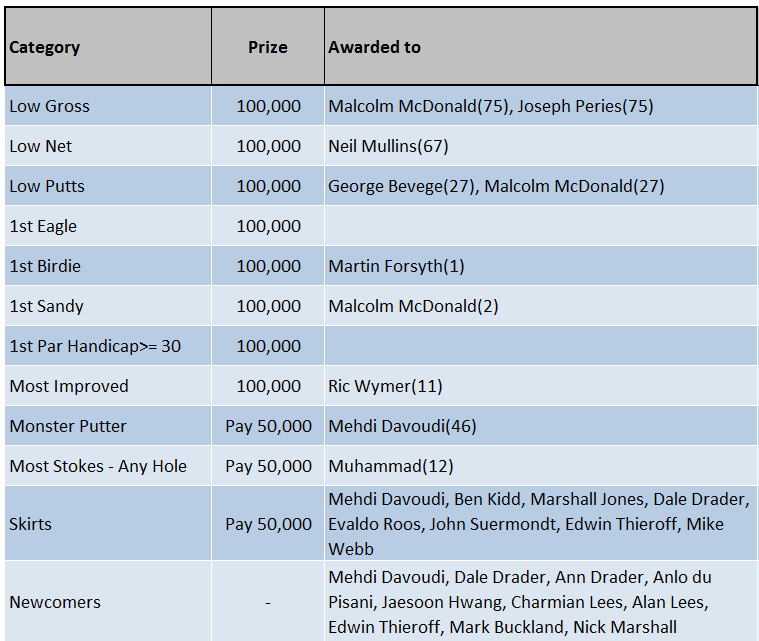 The real culprits on the day who truly earned the privilege to wear the skirt were Evaldo Roos, Mehdi Davoudi, Ben Kidd, Marshall Jones, Dale Drader, John Suermondt, Mike Webb and Edwin Thieroff who helped put a smile back on the Treasurer’s (PoE) face after some lean weeks. Harold Haynes reports that he has purchased a new driver that performs so well that he is now able to reach greens in regulation again…but only if he is allowed to tee off from the white tees. On Sunday he got such a wish since the green keeper had moved the blues up to the whites on most tee boxes. So how many greens did you hit in regulation, Harold?