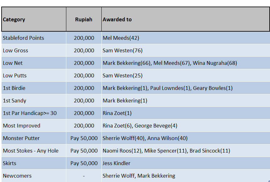 Tee off will be at 11:30 as usual at Karawang where Green Fees etc including cart were a very reasonable 550,000 roops in June – we will confirm cost this time in the next update.