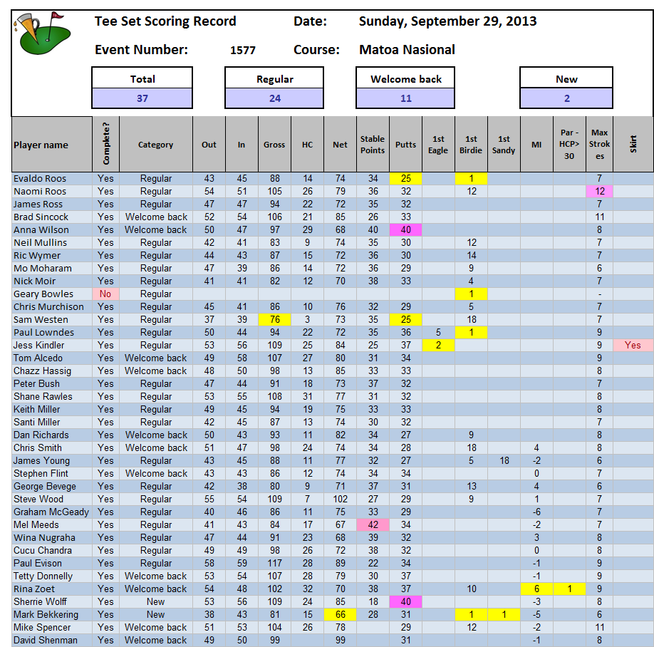 New secretary Brenda did a stellar job of getting all 37 players scores input correctly and even managed to smile through the shock of a table rocking slam dunk score card mid-way through the process.
