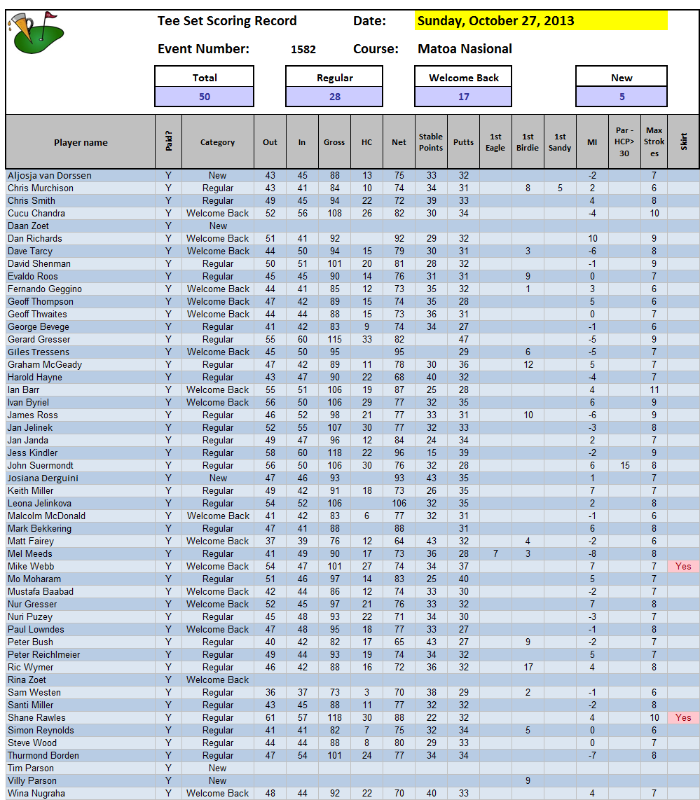 Another bumper day for Newcomers this week so a warm Tee Set welcome to all of Aljosja van Dorssen, Daan Zoet, Josiana Derguini, Tim Parson and Villy Parson. Come back soon.