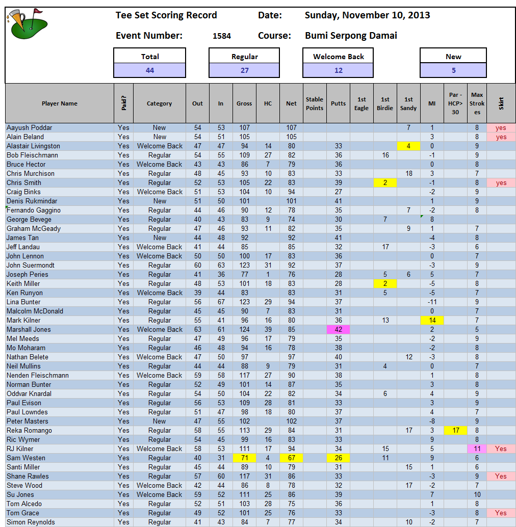 A goodly showing of Welcome Backs also, most notably RJ Kilner who hadn’t played with us for a couple of years and it showed as he got a skirt with his very first swing of the day, and also managed to get Most Strokes with an 11 on the very same hole. Welcome back RJ!!
