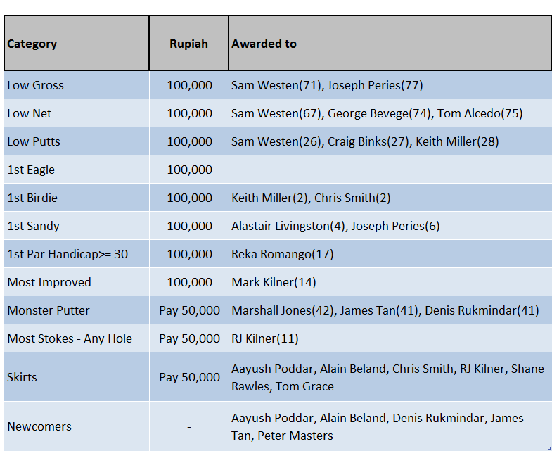 In the Tee Set Matchplay, Fernando Gaggino beat Bob Fleishmann 2 and 1 to earn himself the right to play Joseph Peries in the Kuningan Bracket semi-final, while Matt Fairey beat Wina Nugroho one up at Matoa to progress to the Matchplay Final itself on Tee Set Championship Day. In that Final, Matt will play the winner of the Alistair Livingston/Peries or Gaggino Emas Bracket Final. Got that?