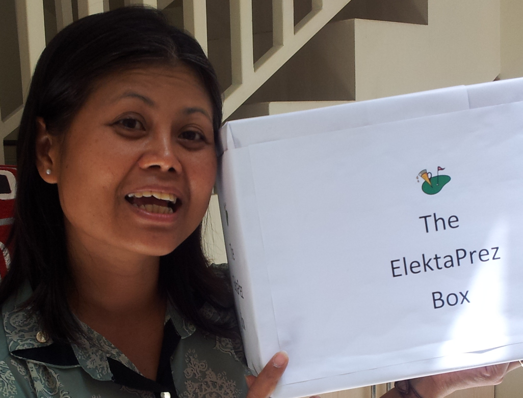 Simply circle your candidate of choice and place it in the distinctive green and white box being modeled here by Santi Miller, who also did an exceptional job of hiding the nature of its original contents – Super Mie!!
