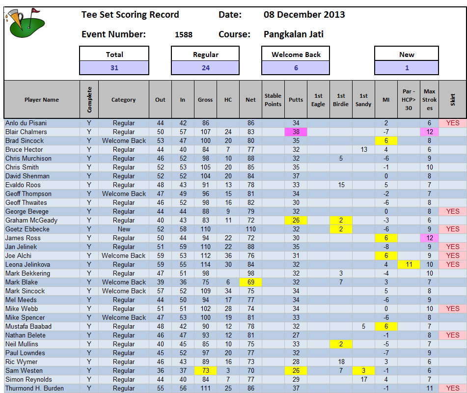 Just six weeks since our last visit to that fine and reasonably priced course off the Jagorawi Tol, Palm Hill. On that occasion Joseph Peries took Low Net with a 74 off the stick while Mo Maharam put in one of his best performances of the year with a Net 69. With the holiday season coming up we are, however, unlikely to match the 39 Tee Setters we saw out on that occasion.