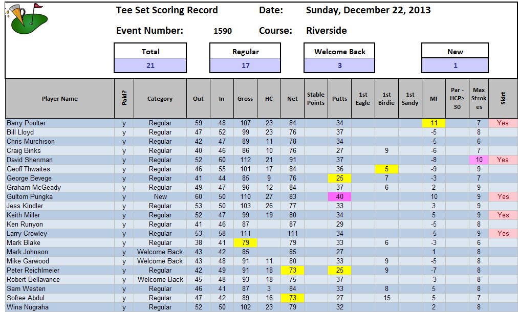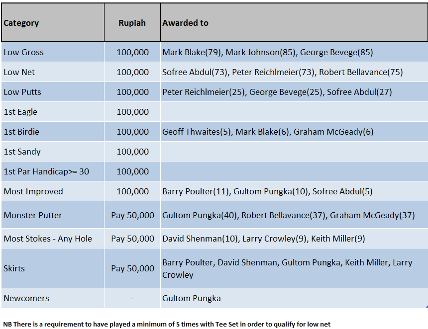 Just one Newcomer made it to the 1st tee box, Gultom Pungkas, so a warm Tee Set welcome to him in his baptism by rain. Welcome Backs were far more numerous at eleven and therefore too numerous to list but included Rod Ritson and Mark Johnson after 28 and 20 weeks away respectively, Robert Bellavance and Barry Poulter after 16 weeks apiece and a Mike Garwood returning for Xmas after 10 weeks of “looking after” his woolly friends in New Zealand.