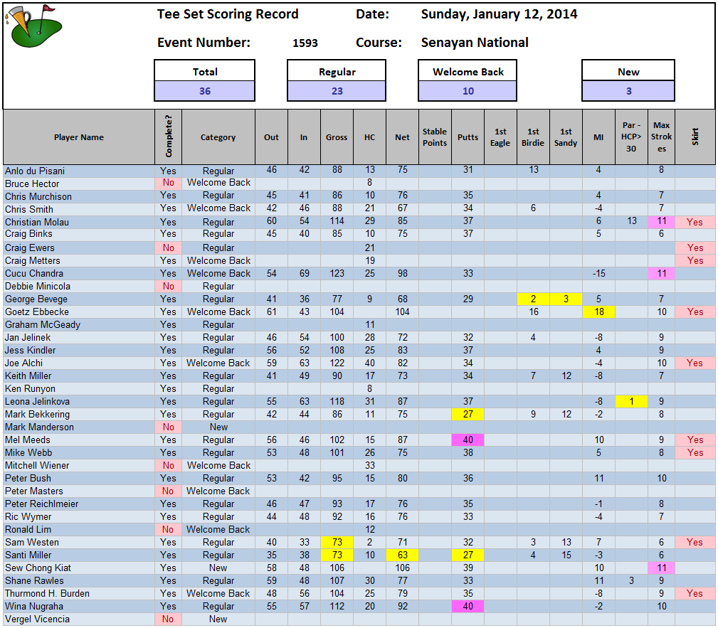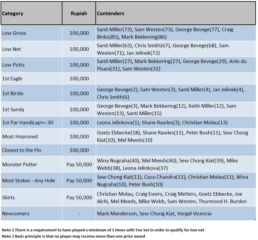 A day of many highlights with several players shooting all time lows including a net 63 from Santi Miller, more skirts than a red wig could sensibly shaken at, a Most Improved of 18, the first time appearance of a skins sideline – and three Newcomers to welcome in Mark Manderson, Sew Cheong Kiat and Vergel Vicencia. A warm Tee Set welcome to you all.