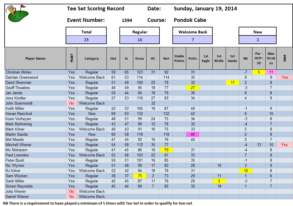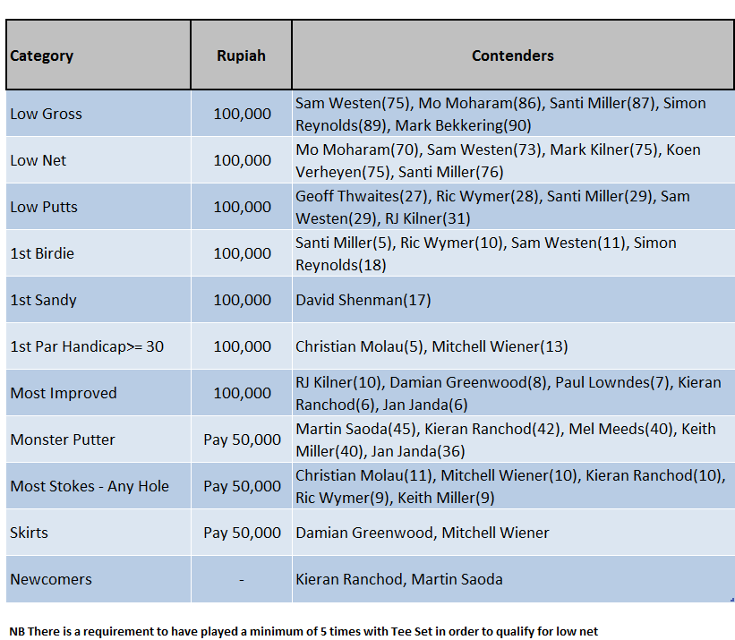 5 Welcome Backs on the day, most notably father and son act, Mark and RJ Kilner, and a John Suermondt freshly returned from Oz and raring to go after the longest Xmas break we have on record. That long break was to be paid for, however, with a trapped nerve or some such bringing about retirement half way for John – and a two hour session on the always welcoming Pondok Cabe pijat couch – while the rest of us enjoyed the excellent playing conditions to be found on the back 9.