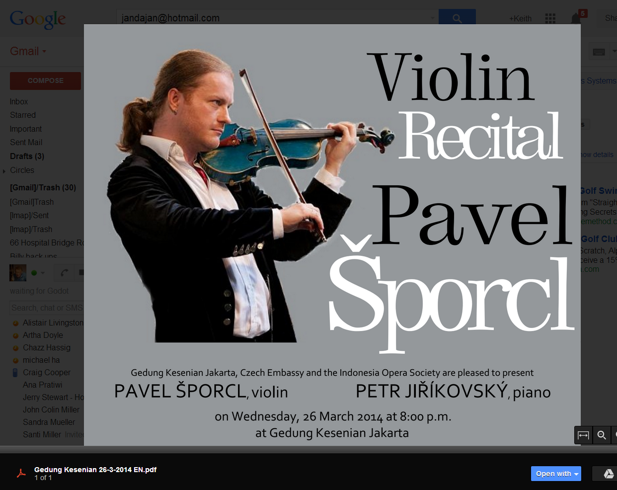 Tee Setters are known throughout the land to be people of culture and refinement and as such will be keen to learn that a quite fantastic Czech violinist, Pavel Sporcl, is coming to town and will be playing at the Gedung Kesenian on Wednesday 26th March at 8.pm. Find more details here.
