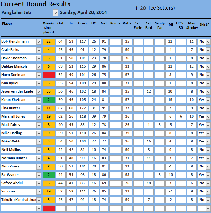 Welcome Backs were a lot busier at 11 players, or more than half the pack, and headed by Bob Fleischmann who played his first round with us since the 2013 Tee Set Championship back in November, while Su and Marshall Jones had their first run out of 2014. Bob made a bit of meal of it by recording his worse score in memory.