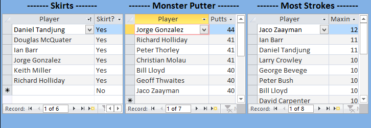 Daniel Tandjung has taken a Skirt in his first two outings with Tee Set and deservedly gets a pat on the back from the treasurer. Others joining him were Douglas McQuater, Ian Barr, Jorge Gonzalez, scribe Keith Miller and Richard Holliday who, as a first timer, must have been wondering what the hell the cross dressing thing was all about.