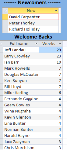 Three Newcomers to report this week with two of them being DOGS, David Carpenter and Peter Thorley and the third being visiting Brit, Richard Holliday, a warm Tee Set welcome to them all. Jeff Landau led the welcome back brigade after being away 29 weeks, closely followed by Larry Crowley at 23 weeks.