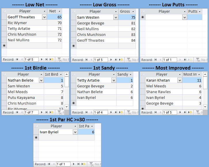 Most Improved with 11 strokes was KK and that’s no mean feat considering the back nine is a lot harder than the front at Jags. Could have been a case of the Geoff Thwaites golden rule in that the improvement on the back is directly proportional to the Bintangs consumed on the front.