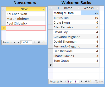Manoj Mishra headed the Welcome Backs list at 25 weeks which puts him on schedule for his usual wife induced 2 rounds a year with Tee Set – and with his only competition being James Tan at 19 weeks.