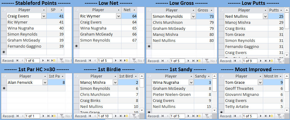 In the other minor prizes, Alan Fenwick made par at the 8th to take the HC>=30 award, Wina took the money at the 3rd with 1st Sandy while Tom Grace took advantage of being allocated the right hole to tee off from to take Most Improved with a 9 shot improvement on his back nine.