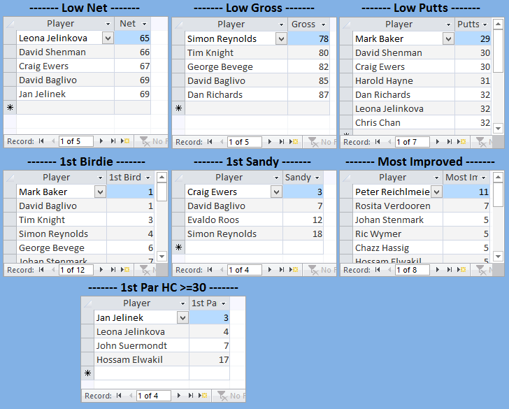 Another Newcomer, Mark Baker, failed to fully appreciate just how difficult the greens were and took Low Putts with a fine 29 blows with the flat one while David Baglivo made sure that the trickiness of those greens were not to be an issue on his first hole as played by sticking it to within 1cm for a tap in and taking 1st Birdie.