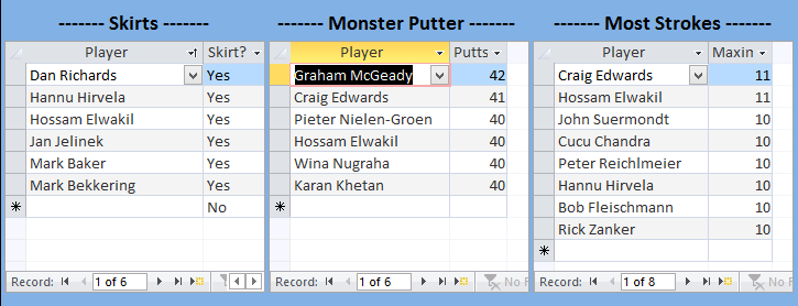 A healthy crop of six skirts and something of a surprise winner of Monster Putter with Grumpy Pirate Graham McGeady, pictured here and clearly getting a lot of sympathy from Pulpy Beverage, taking the honours on his own with 42 putts.