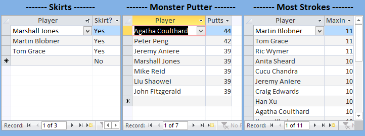 Rather a moderate skirt haul this week but for once we go all of them in the frame, well done fellas. Agatha Couthard’s mammoth 275 weeks away from Tee Set has clearly not improved her putting as she was to take the Monster Putter “award with a convincing 44 blows while Tom double dipped in sharing Most Strokes with the Immediate Past President of Blow Up Holes and Martin Blobner Well done to each nad every one of you, your treasurer loves you all 🙂