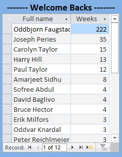 No Newcomers this week but some huge welcomes back with a past Tee Set favorite son, OB (Oddbjorn Faugstad,) taking the honors at a homegenous 222 weeks. Great to see you back OB even if only for a fleeting visit.