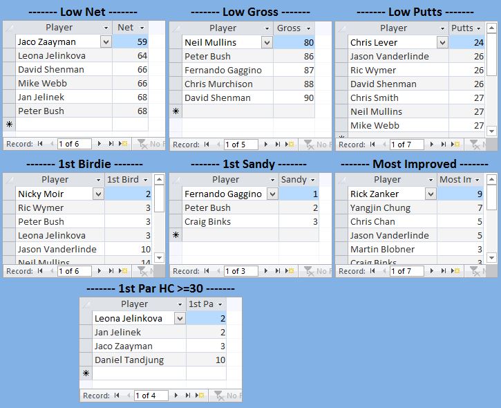 Despite very many other sub-30 efforts, Chris Lever took Low Putts with an impressively low 24 blows with the flat one, while Leona and Jan proved inseparable again, managing to share First par for >= 30 handicappers on the very same hole to ensure they doubled their usual weekly take from the category.