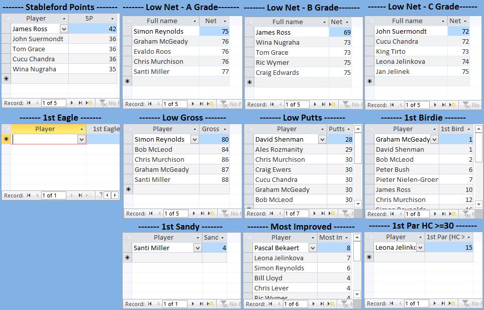 James also demonstated the advantage of Stableford by winning despite also taking the “prize” for Most Strokes on a Hole with 11. That may very well be a unique combination.