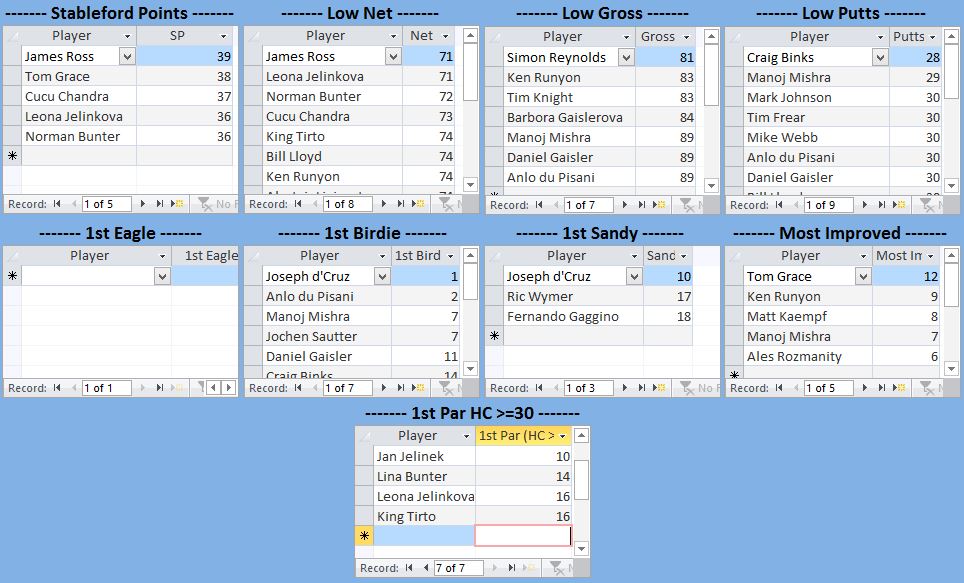Matt Kaempf joined Tom Grace as both a benefactor and beneficiary to the Tee Set coffers, winning back his skirt money with Most Improved. A very late Ken Runyon who managed to set a new record himself by registering at 9am, won Low Net A Grade on a count-back from Alistair Livingston, following a blistering home nine of 37.