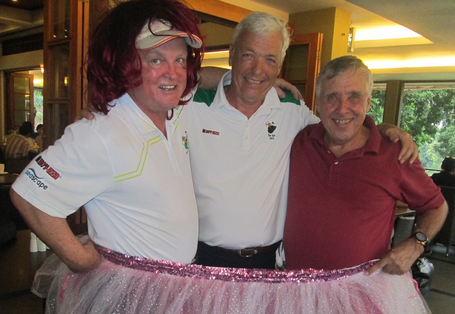 Tom Grace was convinced that having OB-ed well past the red tees with his first drive, that failing to reach the ladies tee box with his second didn’t qualify him for a skirt. Cucu, marked his card for him, however, and thought otherwise while Chris Smith proved that wearing a skirt AND winning Low Net is perfectly feasible. Missing from the skirt photo is seasoned rocker Chris Till, presumably lost in the dressing room trying to find a better stage costume.