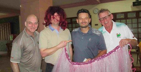 James Ross, newcomer Lars Schaumann, Jaroslav Gaisler and Keith Miller did not cope so well with the tee boxes being set so far back with all them succumbing to the numerous cross dressing opportunities afforded by Tee Set as you see in the photo – Keith with his very first swing of the day – to the delight of a significant if sensibly muted audience.