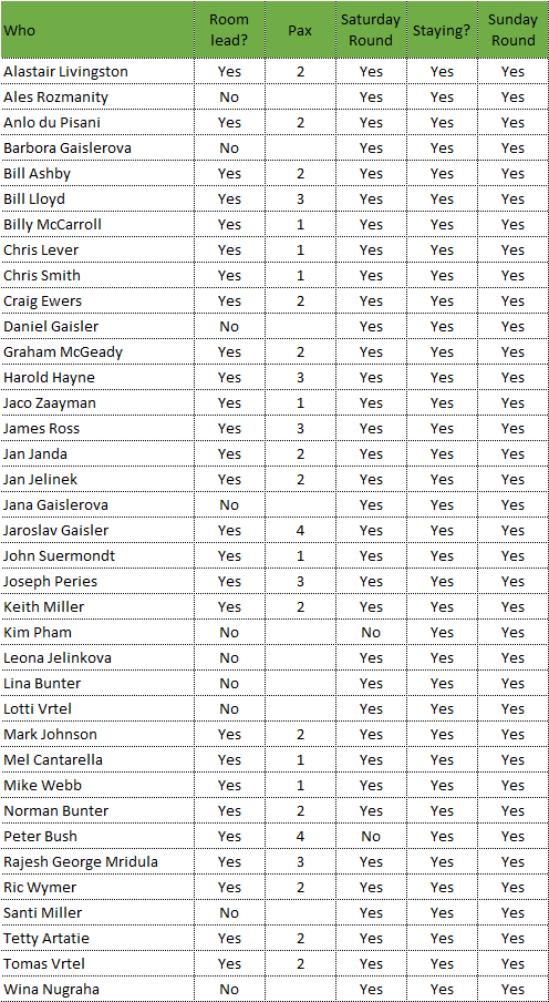 37 Players and 19 significant other are all booked into 28 rooms for the Rancamaya Weekend 16th/17th May, a weekend that promises to be a cracking event – with two rounds on the finest course in Jakarta @ 610,000 roops a pop – and heavily discounted rooms, a Bouncy Castle, Jazz Band, BBQ and enough tinctures to float an Italian Cruise Liner – and all on Tee Set.