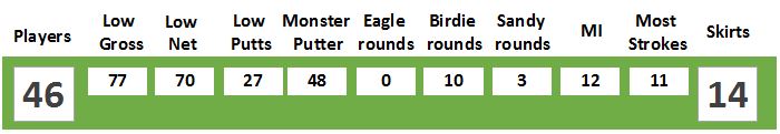 Skirts were at an all time record high of 14 including the somewhat tardily recorded Brandon Curson. The rule about standing behind the line of the tee box when a player is teeing off applies 110% for Brandon as backwards is about the only direction he was not to hit it from the tee today. We can expect a steady stream of skirt income from Brandon, at least until he gets that driver under control!!