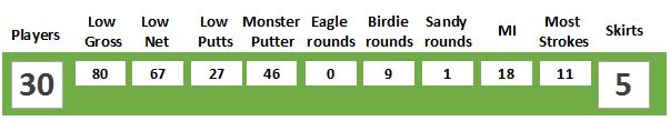 A rather more modest than of late 5 skirts to report this week, with Ivan Byriel returning to the Sunday cross-dressing fraternity after an absence from the rostrum of more than 2 years while Newcomer Olivier Bosmans took Monster Putter with a splendid 46 of them to win by a clear 4 strokes and Thurmond’s 11 was good enough to take Most Strokes, to the visible relief of a whole bunch of Tee Setters just one stroke behind him.