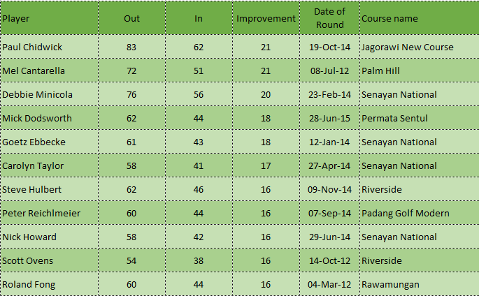 Mel was right of course, see the Most Improved League table below from which it is clear that Mick was only to secure equal 4th place with an 18 shot improvement on his back 9 today.