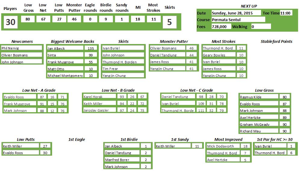 Happy to report that Ivan got his money back, and a little more, by securing 1st Par HC >=30 on the very first hole he played. Even more delighted to report that Keith took Low Putts with 27 and was alone in recording a Sandy Par, though the Tee Set principle that only one prize is awarded per player meant he had to pay for his own food 😦