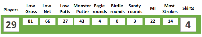 And now for the fun….an unexpectedly low number of skirts at four, unexpected given the advanced ladies tees, with just 4 serial cross dressers keeping the Treasurer happy. Alan was on safari on the Stone Hills par 5 8th with a 14 stroke efforts which took him across streams, up hills, into bunkers and eventually to a green where his playing partners gave him a warm welcome back to the group … and a 10ft gimme to put him out of his misery.