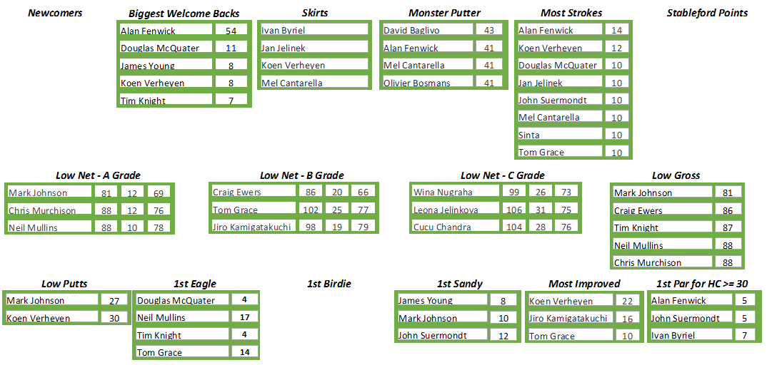 In the skills prizes, Jaco navigated the tricky greens with 31 putts, James was all smiles after his First Sandy on the 8th, Alan and John “Malty” Suermondt shared the 100k for First par Over 30. Special mention to Koen who challenged the Tee Set Most Improved record with a 22 stroke difference…going out in an awe-inspiring 70 on the admittedly challenging Stone Hills course.