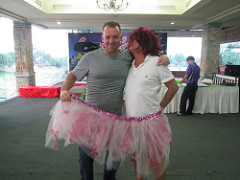 Lis was to also claim the Monster Putter but gallant husband Ric, the immediate Past President for Almost Everything, stepped in to grapple with the monkey. Mick and Mike made a fine pair, the only two that earned a skirt. We didn’t manage to catch Olivier on film for Most Strokes but he was honest enough to admit the 12 he took and pay the fine.