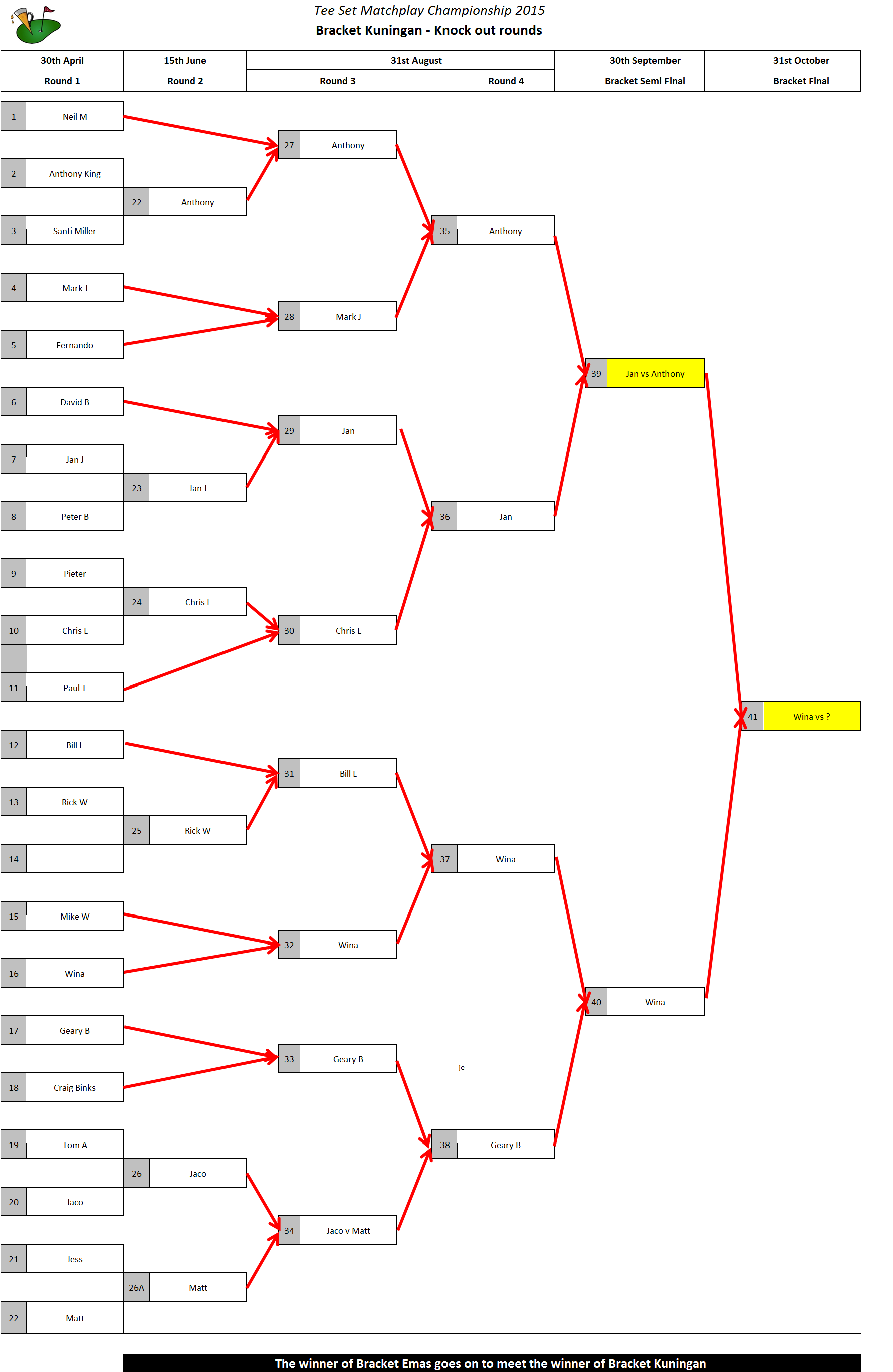 Overall results are provided below – the Emas bracket has now reached the final – James is ready to face off with the Singing President again, this time at Gading Raya when Tee Set plays there in a few weeks time. In the Kuningan bracket Wina has made it through to the final against the winner of Anthony and Jan Janda.